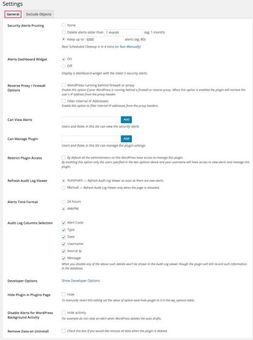 The Exclude Objects tab gives you the power to exclude users, roles, custom fields and IP addresses from monitoring. You might be tempted to exclude your username, or all “administrator” users, but be careful. Some attackers could gain access to your site and pretend to be one of your admin users. You would then miss out on all the malicious activity that the attacker is performing.
